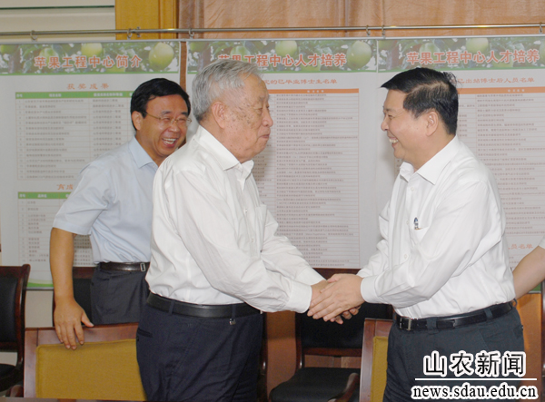 姜大明一行在学校领导陪同下,首先来到国家苹果工程技术研究中心,向著名果树专家、中国工程院院士束怀瑞送上花篮,致以节日的问候和祝福。束怀瑞向省领导介绍了我省果树产业发展情况,并就提高果品品质、增加效益等提出了建议。姜大明认真听取束院士的介绍和建议,他说,山东果树产业在全国占有突出的地位,我省农业产业增加值一直排在全国第一位,靠的就是科技,要实现农业健康发展,农民持续增收,必须进一步加强农业科技创新和技术研发,大力发展高产、优质、高效农业。要重视科研与市场的结合,努力实现科研、推广和市场无缝对接。