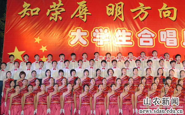 10月13日晚,东校区青年广场歌声嘹亮,热潮涌动。由校团委、校学生会主办的“知荣辱、明方向、树新风”大学生合唱比赛决赛在这里隆重举行,2011级新同学用激情抒发心中的理想,用歌声表达对伟大祖国的赞美。