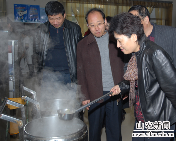 走进学生食堂,邢善萍首先来到学校为学生提供的免费汤大桶前,用勺子搅动看汤的成色。在就餐人流涌动、饭菜花色繁多的餐厅里,她饶有兴致地在多个摊点前参观、询问,了解饭菜价格,询问经营模式,掌握学生就餐情况。她要求有关部门在切实重视食堂饭菜安全的前提下,开动脑筋想办法,提高质量,尽可能满足同学们的多种就餐需求。