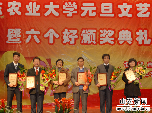 节目中间的“六个好”颁奖典礼一次次把晚会的热烈氛围推向高潮。第二届“身边的感动――六个好”评选活动,是围绕金年会创先争优、争做科教兴农先锋而开展的一项重要活动。在创先争优活动中,各基层党委高度重视,广大党员积极参与,奋发向上,求真创新,涌现出一大批优秀团队和个人,此次受到表彰的“六个好”就是他们中的优秀代表。“身边的感动――六个好”评选活动得到全校师生的热烈响应,大家踊跃投票,推荐身边的榜样。经过网络投票、现场投票,最后,泰山学者孔令让教授获得好党员称号、外国语学院学生张敏获得好团员称号、植保学院李向东教授获好教师称号、体艺学院学生黄帅获好学生称号、经管学院办公室副主任王园林获好职工称号、农学院退休教授孙兰珍获好长辈称号。另外54名正式候选人获得提名奖。校领导依次走上主席台,向获奖者颁奖、祝贺,合影留念。