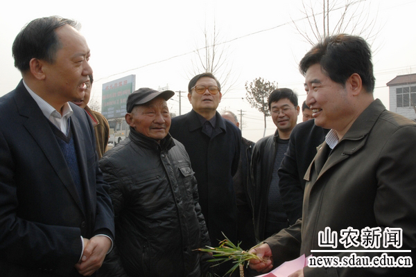 山东农大与泰安市岱岳区多年保持着良好的合作关系。最近几年,学校在岱岳区建立了小麦、玉米,蔬菜、畜牧、林果、茶叶新品种试验示范和高产攻关田示范基地,专家教授们经常深入田间地头,推广农业新品种、新技术,服务农业农民。今年刚过元旦,1月2日,副校长董树亭就带领学校科技人员,冒着瑟瑟寒风,来到岱岳区满庄镇滩清湾村宣讲中央农村工作会议精神。大家钻大棚,进麦田,了解现代农业发展情况,对大棚建设、塑料薄膜选用、麦田管理、林果和畜牧业发展进行现场指导。