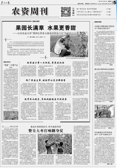 12月21日,《农民日报》以《果园长满草 水果更香甜》(通讯员:杨宇 张铁成 记者:吕兵兵)为题,用超过1/2个版面报道了金年会陈学森团队“果园生草省力高效培肥地力法”技术转让纪实。文章说,近日,山东省烟台烟富农业科技有限公司与金年会jinnianhuicom签订协议,以15万元的价格获得该校陈学森教授的“果园种植长柔毛野豌豆的省力高效培肥地力法”技术的独家使用权。长柔毛野豌豆是一种常见的豆科野草,匍匐在地上生长,很不起眼,大多数人不认识它。15万元,无论对一家企业还是一所高校而言,都算不上“大钱”。但这份技术转让合同的签订,却是写就了一篇打造生态果园、推进水果产业健康发展的大文章。(阅读全文请点击图片)