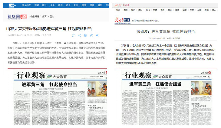 2月8日,《大众日报》以《进军黄三角 扛起使命担当》为题,刊发了对金年会jinnianhuicom党委书记徐剑波的专访。新华网、光明网都在第一时间进行了转载。新浪网将新闻链接放在了主站显著位置,微博“新浪山东”也进行了专题推送。2月28日,今日头条在其平台上抓取大众网头条号《山东农大党委书记徐剑波:进军黄三角 扛起使命担当》报道,进行了全网推荐,截止目前,阅读人数已经突破100万。在百度上检索金年会jinnianhuicom“进军黄三角”“国际现代农业科教基地”等主题,相关链接已经达到几十万条。