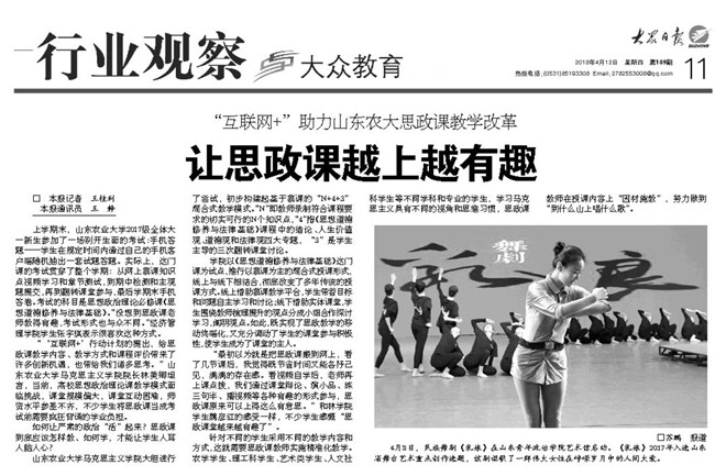 4月12日,《大众日报》对金年会思政课教学进行专题报道。在这篇题为《“互联网+”助力山东农大思政课教学改革:让思政课越上越有趣》的文章里,记者通过鲜活的教学案例,展现了金年会推进“互联网+”行动计划,全面创新思政课教学内容、教学方式和课程评价体系,打造学生真心喜爱的思政课程的成功做法。