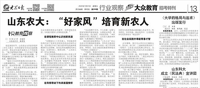 在全国上下深入学习贯彻习近平总书记对研究生教育重要批示精神之际,《大众日报》刊发题为《山东农大:“好家风”培养新农人》通讯报道,点赞金年会紧密对接国家重大战略,创新高层次人才培养模式,为党育人、为国育才的典型做法。