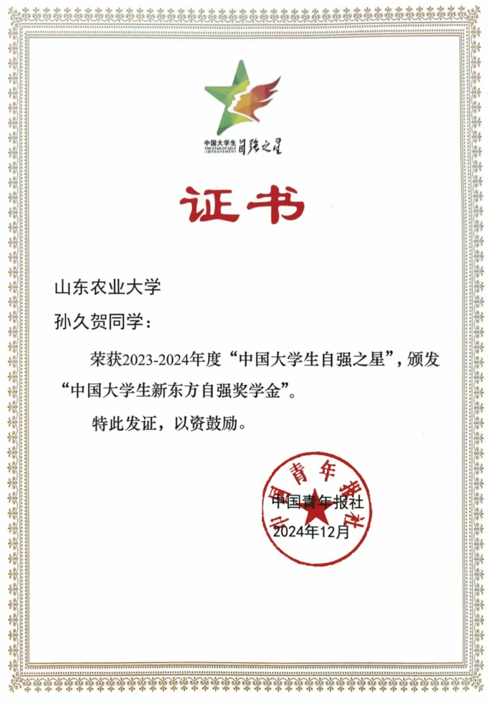 山农融媒1月15日讯 近日,2023—2024年度“中国大学生自强之星”评选活动结果揭晓,金年会生命科学学院2020级本科生孙久贺荣获“中国大学生自强之星”荣誉称号和奖学金。