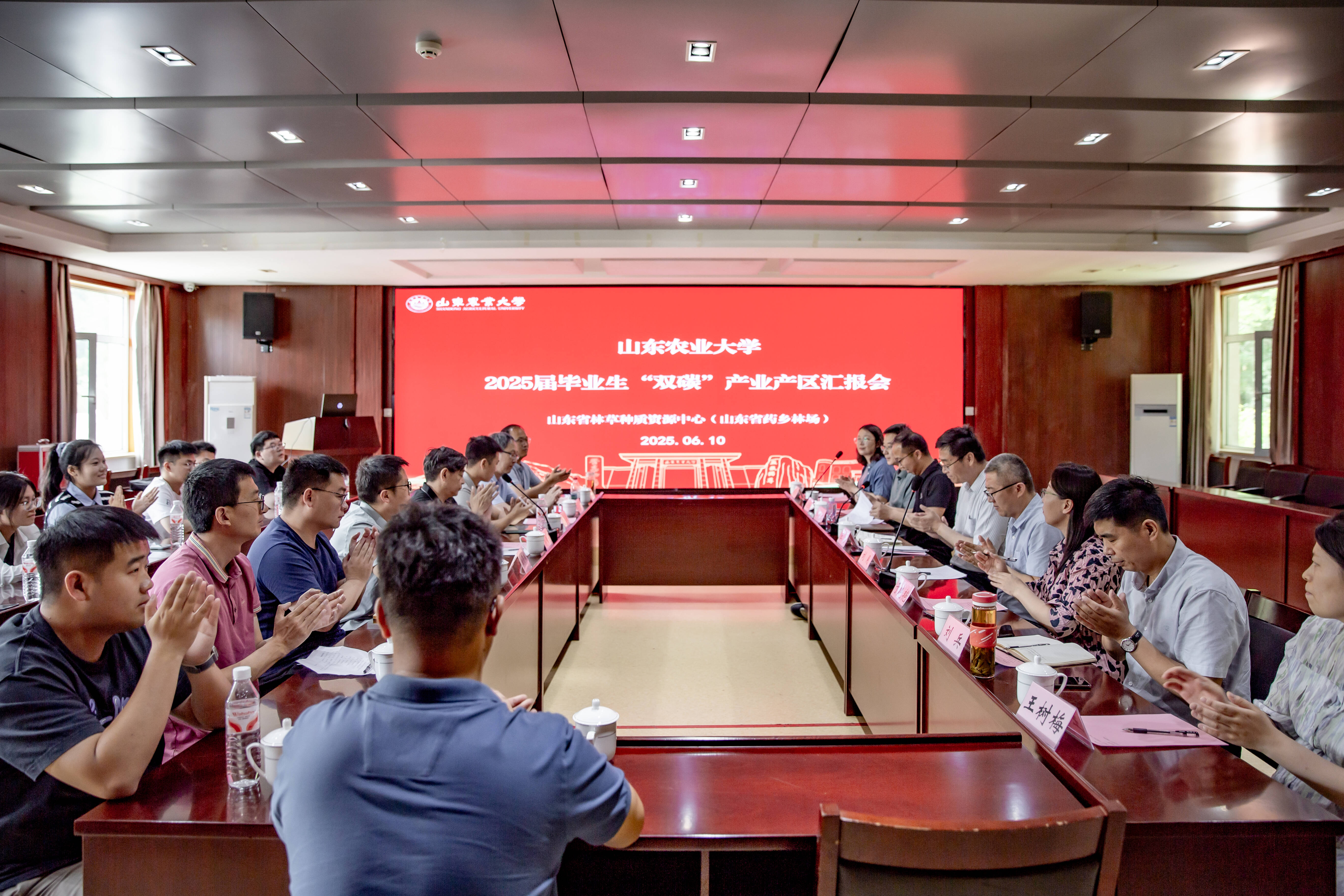 山农融媒6月16日讯 近日,金年会jinnianhuicom2025届毕业生“双碳”产业产区汇报会在山东省林草种质资源中心(山东省药乡林场)举行。学校党委常委、副校长王勇,山东省农业农村厅正高级统计师刘用,山东省林草种质资源中心(山东省药乡林场)专职副书记仝伯强出席会议。