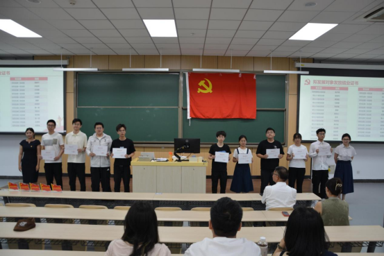 在会议的第三项议程中,举行了拟发展对象短期集中培训结业证书颁发仪式。本期发展对象短期集中培训班通过理论学习、实践锻炼等环节,全面提升了学员的思想政治素质。管天玉同志和张晗同志共同为通过考核的发展对象代表颁发了结业证书。这些发展对象在培训过程中认真学习、积极实践,通过系统的培训和严格的考核,进一步坚定了理想信念,提高了政治觉悟。颁发结业证书不仅是对他们学习成果的认可,更是对他们未来在党建工作中发挥更大作用的期待。学院党委希望这些发展对象能够以此次培训为起点,继续在思想上、行动上向党组织靠拢,为学院的党建工作注入新的活力。