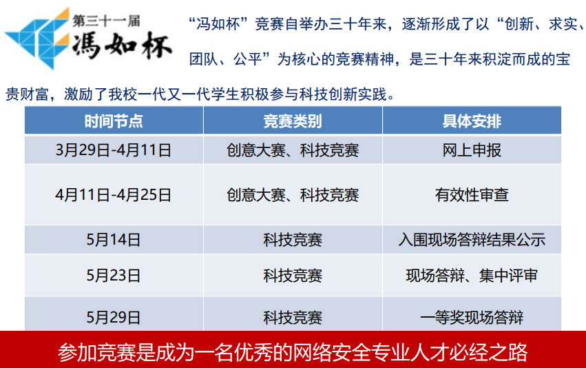 全国大学生信息安全竞赛和冯如杯是很好的提升个人能力的机会,希望同学们积极参与!更多竞赛相关信息,请继续关注后续推送。