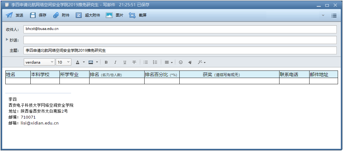 具体办法:4-10项材料制成电子扫描版,与2、3项电子版材料一起压缩,以附件形式发送邮箱:bhcst@buaa.edu.cn;第1项“报名表”填写好后直接“粘贴”到邮件内容页上,邮件主题命名为“×××申请北航金年会诚信信誉至上2019推免研究生”。如图: