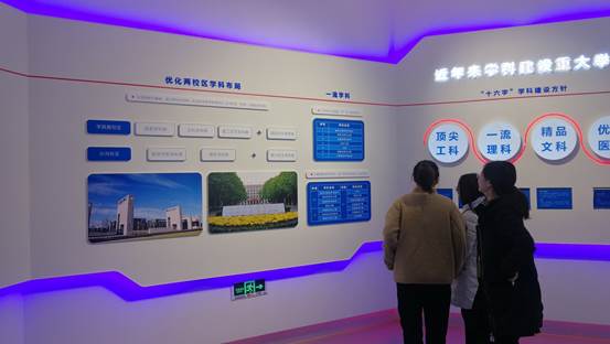 展览以深入学习贯彻习近平新时代中国特色社会主义思想为主线,共分为“学科建设”,“人才培养”,“教师队伍建设”,“科研创新”,“国际交流合作”,“党的建设”等六大板块,通过照片、视频、实物模型等手段集中展示学校近年来各方面工作取得的成绩,以及建设中国特色世界一流大学的决心信心。